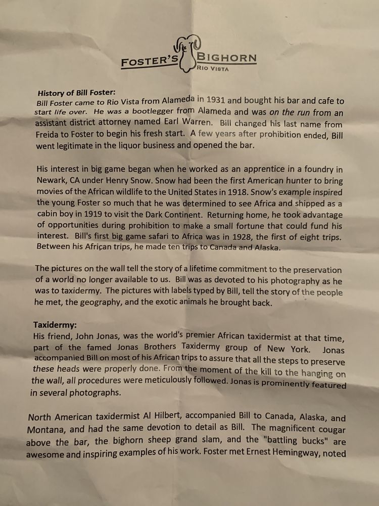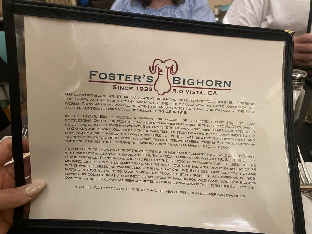 Foster’s Bighorn, located in Rio Vista, CA, offers a unique American bar experience with a focus on taxidermy decor. Customers rave about the delicious food options, with highlights like Chicken Marsala, prime rib, and lamb specials. The restaurant provides a casual atmosphere, suitable for various occasions such as lunch, dinner, and special events. The menu includes vegan and vegetarian options, making it catering to a diverse range of preferences. Notable features include a full bar, outdoor seating, pool table, and Wi-Fi for added convenience. The attentive service and quirky safari lodge ambiance create a memorable dining experience. Foster’s Bighorn is a must-visit for those seeking a fun and enjoyable meal in a one-of-a-kind setting.